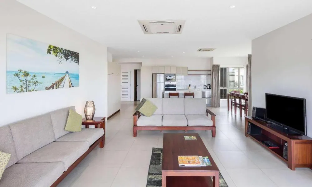 The spacious apartments feature modern amenities, full kitchens, and private balconies overlooking lush tropical gardens. Perfect for families or couples, enjoy the serene ambiance and all the comforts of home in a stunning island setting.